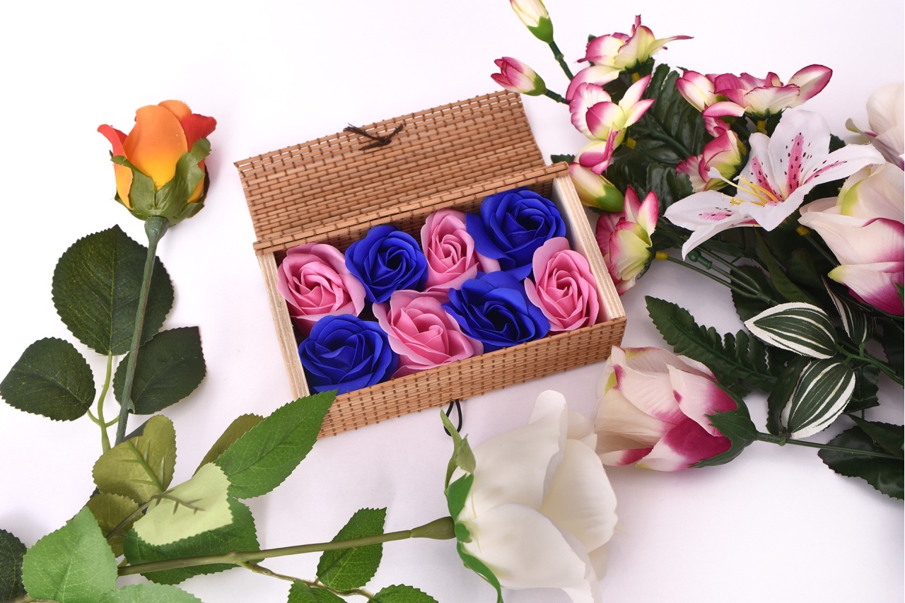 SET DE CADOU SĂPUN – Deosebește-te de ceilalţi, oferă un cadou cu adevărat excepţional, realizat manual – 8 trandafiri, făcuţi manual de artizanii autohtoni. Setul este ambalat într-o cutie decorativă din bambus, realizată manual.