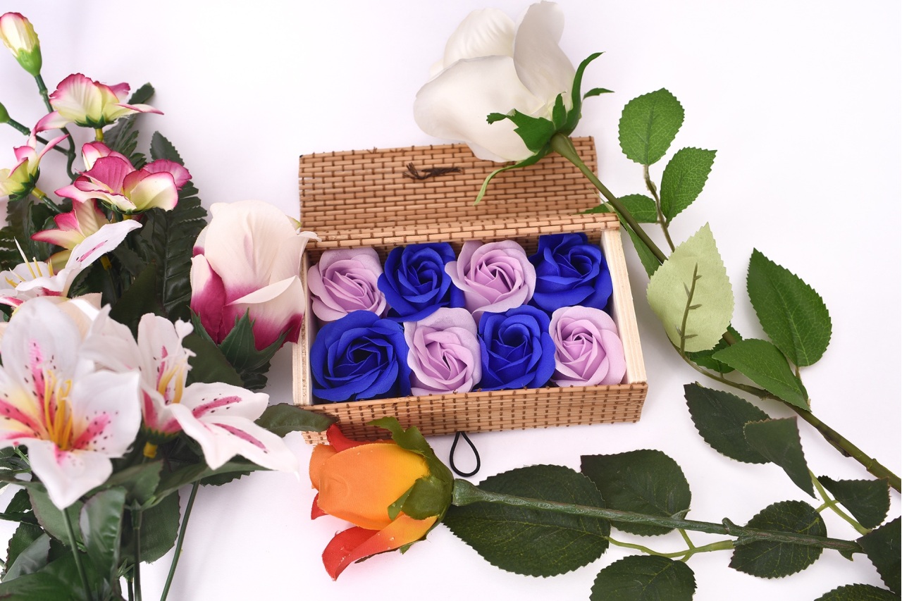 SET DE CADOU SĂPUN – Deosebește-te de ceilalţi, oferă un cadou cu adevărat excepţional, realizat manual – 8 trandafiri, făcuţi manual de artizanii autohtoni. Setul este ambalat într-o cutie decorativă din bambus, realizată manual.